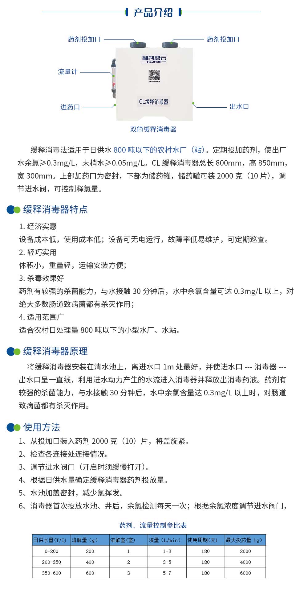 :適用于日供水量800m3以下的水站,定期投加藥劑,使出廠水余氯≥0.3mg/l,末梢水≥0.05mg/l。